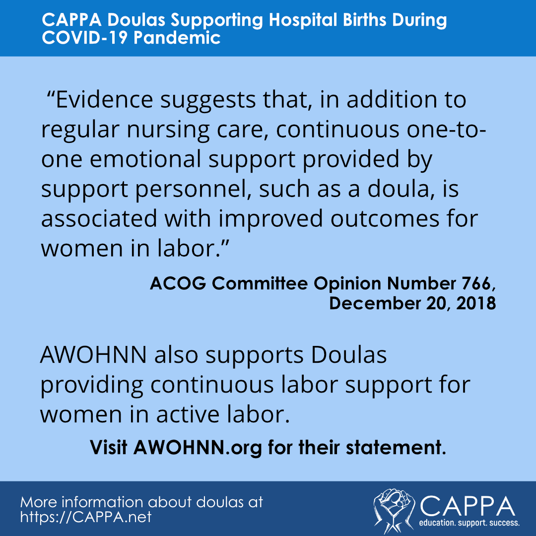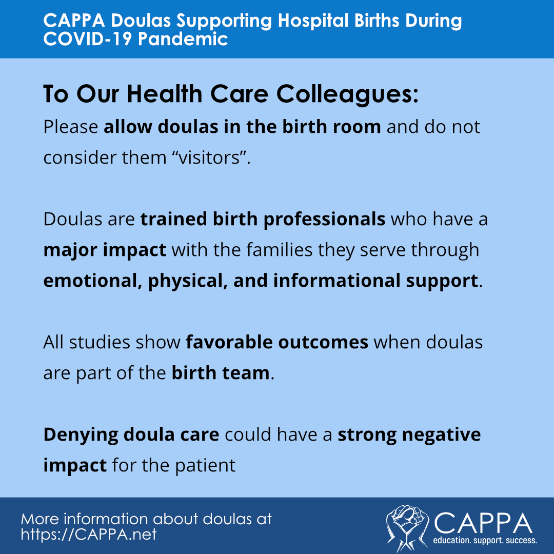 Your CAPPA Labor Doula Faculty team would like to share some ideas for supporting your clients if hospitals are not allowing doulas to provide support during labor. Please remember that it is your professional responsibility to follow CDC recommendations including staying home if you have any type of illness symptoms, following proper hand washing protocols, and keeping up to date with any new developments.